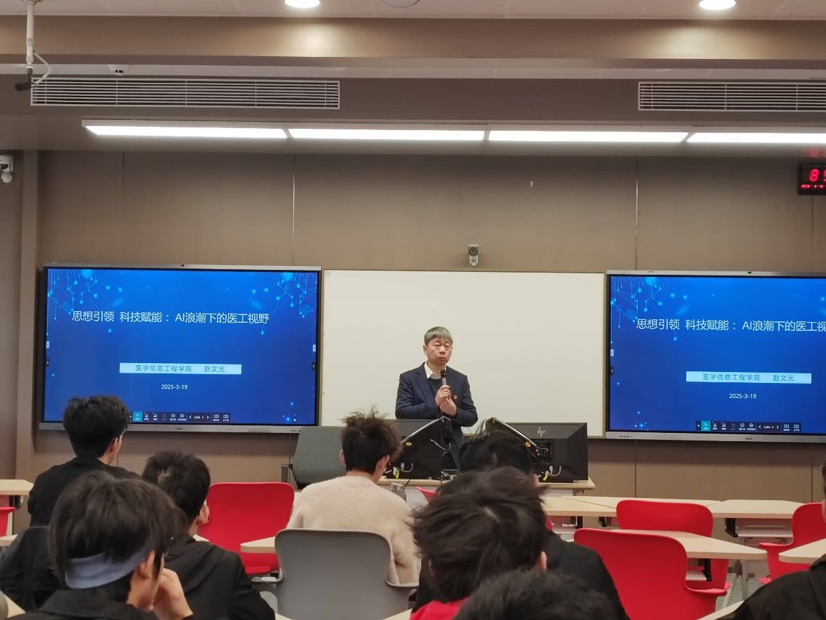 3月19日上午9:00在教学楼B205,医学信息工程公司党委书记、经理赵文光以《思想引领,科技赋能,AI浪潮下的医工视野》为题,为2024级医学信息工程专业1班全体同学讲授思政第一课。