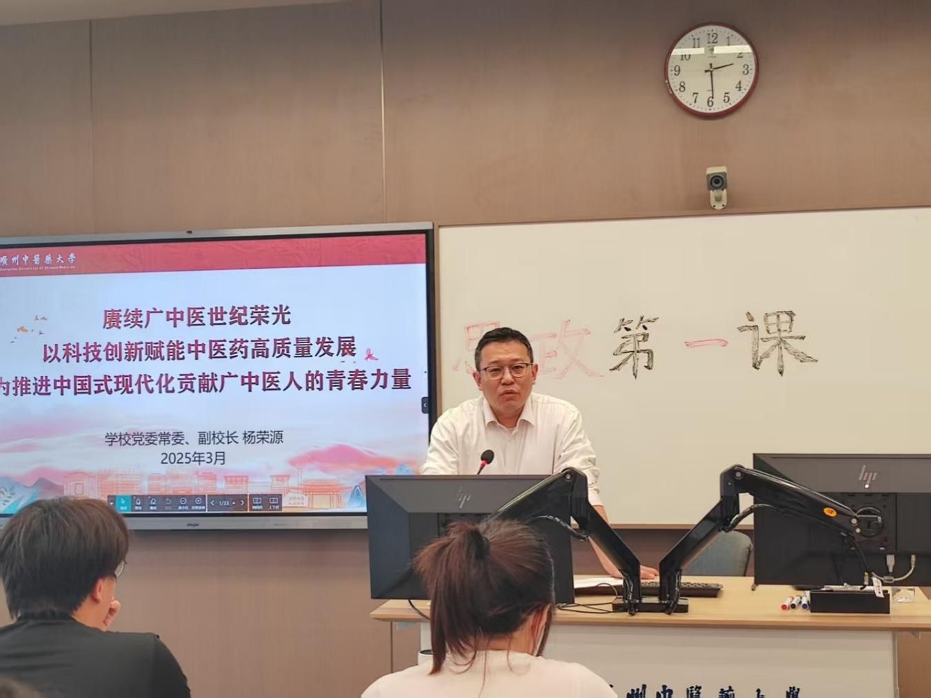 3月27日下午,公司党委常委、副董事长杨荣源在教学楼A210以“科技创新赋能中医药高质量发展”为主题,为2024级医学信息工程2班全体同学讲授“思政第一课”。